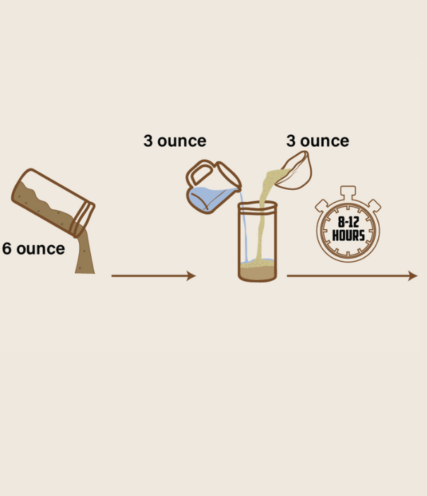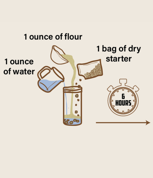 Step 1: 1st feeding- Pour the contents of the sourdough starter packet into a jar and add 1 ounce (28 grams) of filtered water and 1 ounce (28 grams) of white flour (organic flour is recommended, but regular will work too). Loosely cover the jar and place it in a spot where the temperature is between 75-82°F (24-28°C). Let it sit for about 6 hours, stirring at least three times during this period.