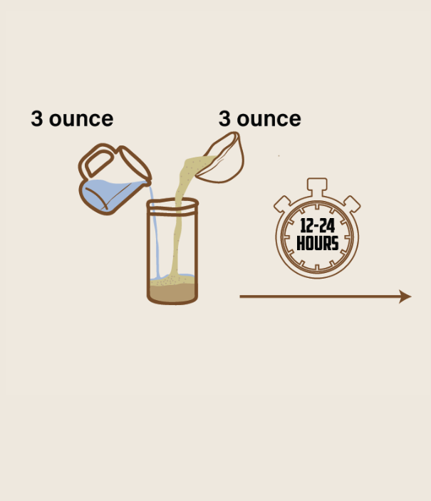 Add 3 ounces (90 grams) of unbleached all-purpose flour and 3 ounces (90 grams) of filtered water. Mix gently and loosely cover the jar. Let it sit for at least 8-12 hours, during which you should begin to see bubbles forming on the surface